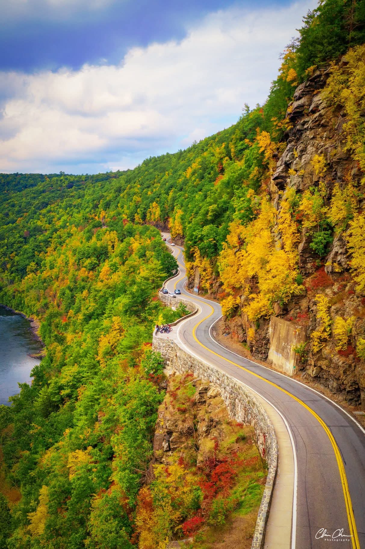 The group pulled over at one of the stone-lined overlooks to take in the view. Bikes parked in a perfect row, engines ticking as they cooled, riders leaned over the guardrails, taking in the Delaware shining below. Cameras came out. Stories were swapped. Laughter carried over the cliffs.